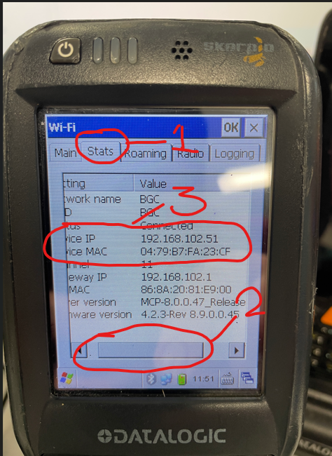 If you now proceed to tap on the Stats tab (1) at the top and you will need to scoll the slider bar (2) to right to obtain the full IP and MAC address (3).